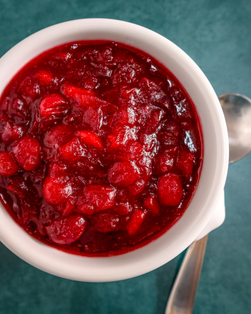 Natural thickness without gelatin. As the cranberries burst and cook down, they naturally thicken the sauce. The diced apple adds extra body, creating a spoonable texture without the need for cornstarch or gelatin.