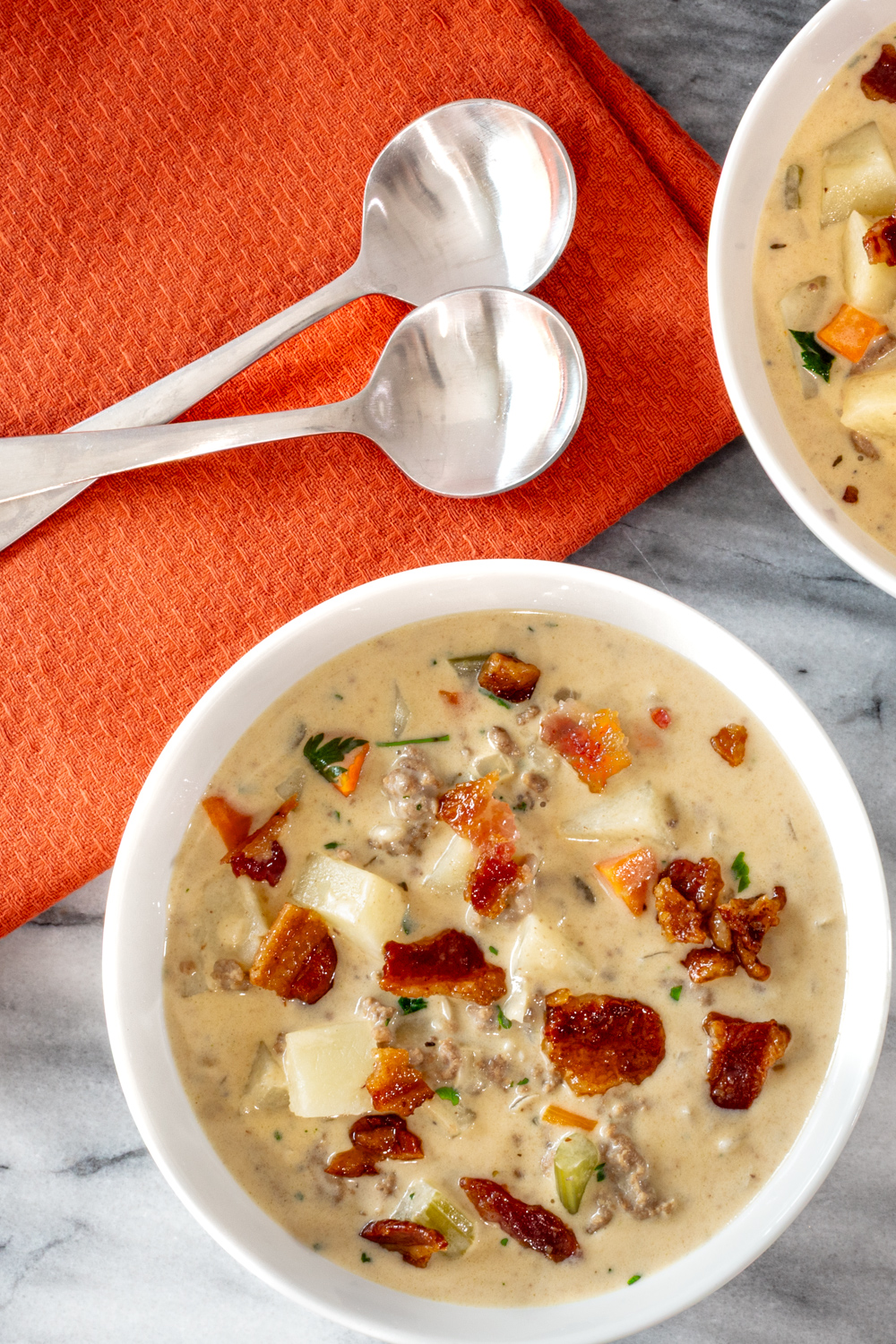 - Big cheeseburger flavor. The combination of bacon, ground beef, onions, cheddar, and a creamy base recreates the essence of a bacon cheeseburger in a bowl, with every component contributing depth and richness.