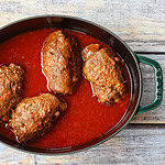 These German beef rolls, or Rouladen, are filled with a savory mixture of bacon, onion, carrot sticks, and bacon. The beef rolls are cooked to perfection in a simple tomato-based sauce.