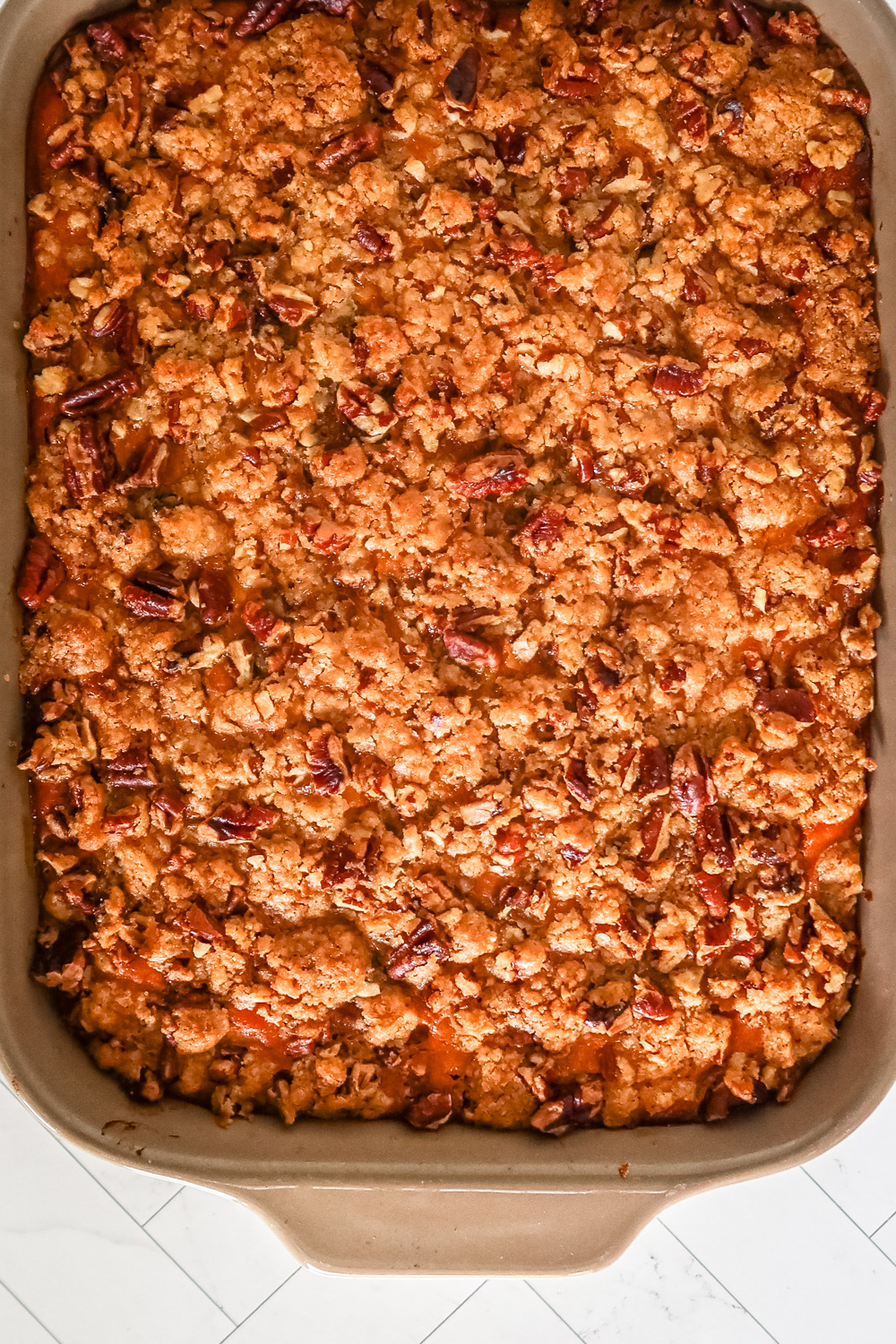 - Finish the Dish: Transfer the sweet potato filling to the prepared baking dish and spread it evenly. Sprinkle the pecan mixture over the filling.