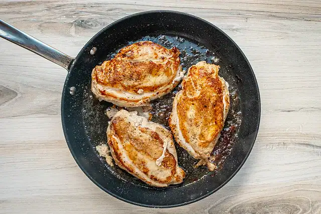 - Sear the Chicken: Add 1 tablespoon each of olive oil and butter to the skillet and place it over medium-high heat. Pat the chicken with paper towels to dry and season on both sides with salt and pepper. Add the chicken breasts to the skillet (skin-side down if they have skin) and cook for 4 to 5 minutes per side, or until golden brown and the internal temperature reaches 165°F.