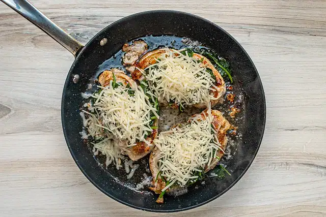 - Assemble and Melt the Cheese: Top each chicken breast with a mound of wilted spinach and about 3 tablespoons of shredded Gruyère cheese.To melt the cheese, heat the broiler. Place the skillet 6 inches from the broiler element and broil for 1 to 2 minutes, or until the cheese is melted and bubbling. Watch closely. Alternatively, cover the skillet and place it over medium heat to melt the cheese.