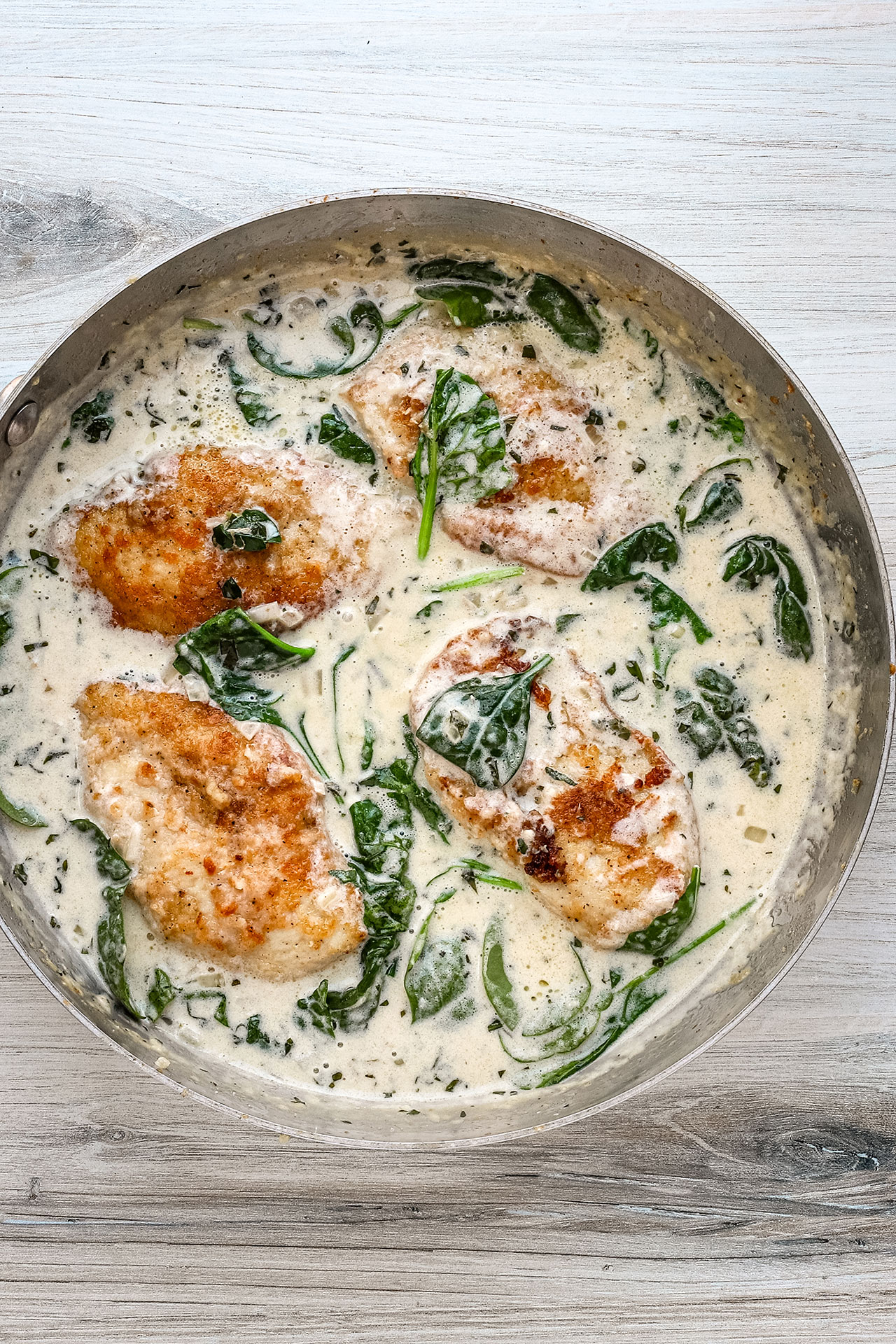 Spinach for balance. Fresh baby spinach wilts gently into the sauce, adding color and nutrients while cutting through the richness. It gives the dish a classic Florentine character and helps round out the meal.