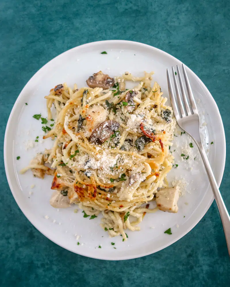 Chicken tetrazzini is a delicious, comforting all-in-one pasta casserole. This version is made with typical tetrazzini ingredients: chicken, pasta, mushrooms, shallots, garlic, Parmesan cheese, and an easy creamy sauce. I added some spinach to the tetrazzini for color and extra nutritional value. It’s an easy dish you can throw together in about 15 to 20 minutes, then you just pop it in the oven to bake, and dinner is served! I like to make the sauce mixture early in the day or the day before, then all I have to do is warm up the sauce, cook the pasta, mix it all together, then bake.