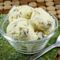 To add the cookie dough to homemade ice cream, roll it out about 1/4 to 1/2-inch thickness between sheets of plastic wrap. Freeze until your ice cream is churning and nearly done. Cut the cookie dough into small squares and then add them to the churning ice cream shortly before it’s done. Pack the ice cream into a container and freeze.