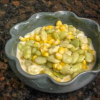 - Combine the cooked lima beans, corn, cream, and butter in a saucepan.
