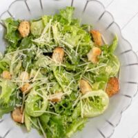 This easy Caesar salad is a classic dish made with a few basic ingredients: romaine lettuce, Parmesan cheese, and croutons. While the traditional Caesar dressing contains anchovies and raw eggs, our version replaces the eggs with mayonnaise and omits the anchovies. Even with these changes, it’s a tangy, absolutely delicious dressing that will elevate your salad to a whole new level.