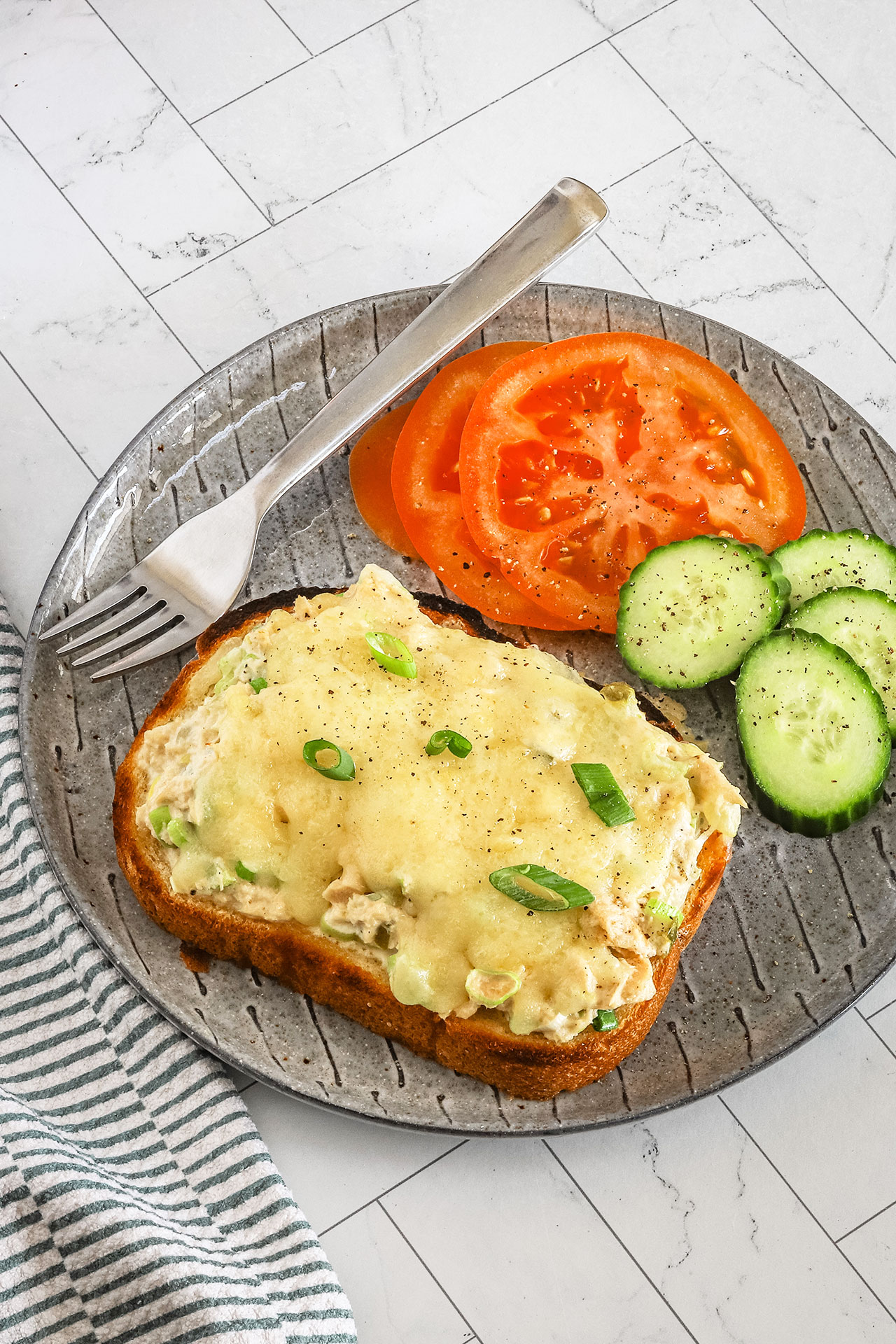 - Pile the tuna salad onto each slice and mound the cheese generously on top. Use finely grated cheese for the most even melt.