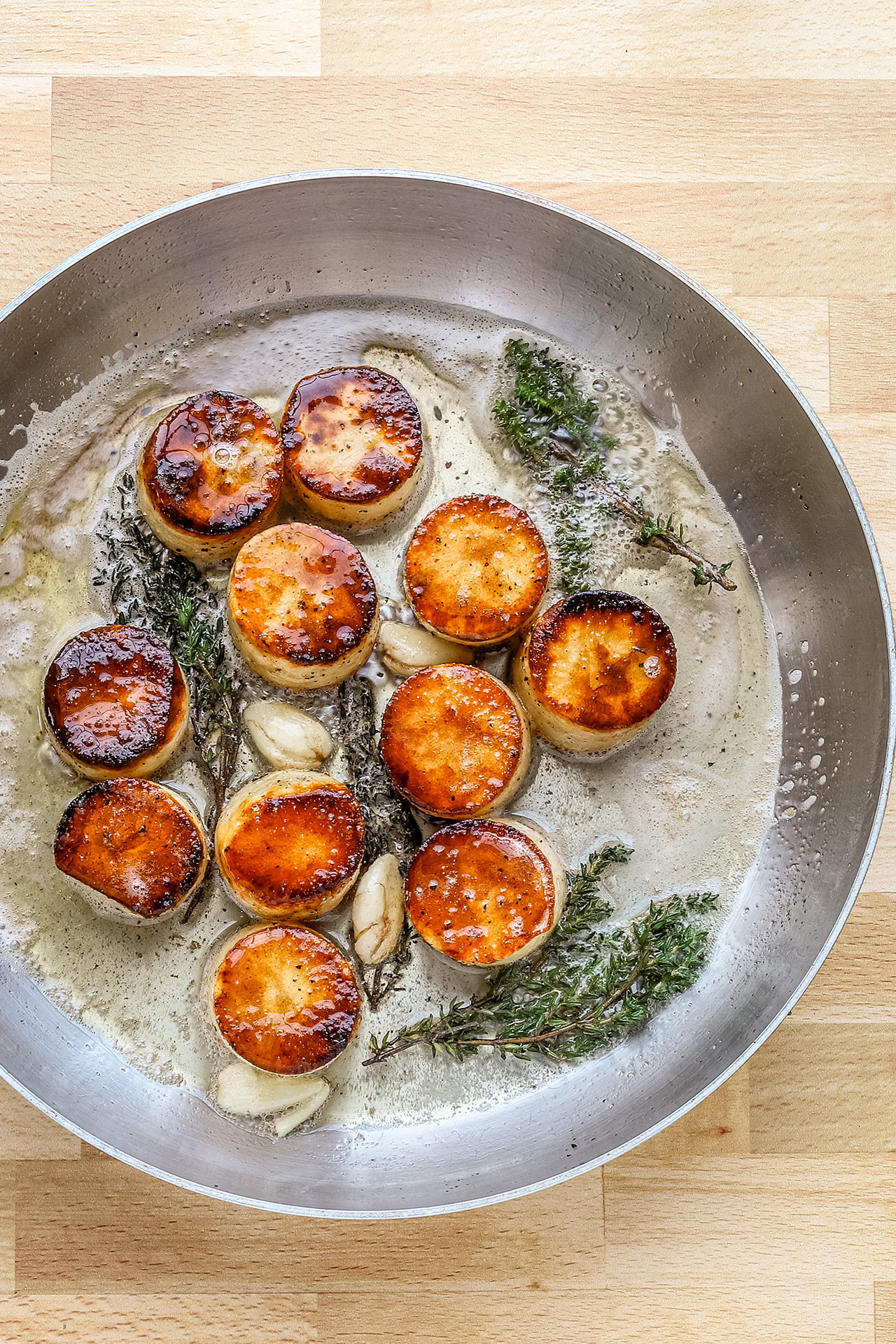 - Add butter, garlic, and thyme to the skillet. As the butter melts and foams, spoon it repeatedly over the potatoes to develop flavor and help the tops brown slightly.