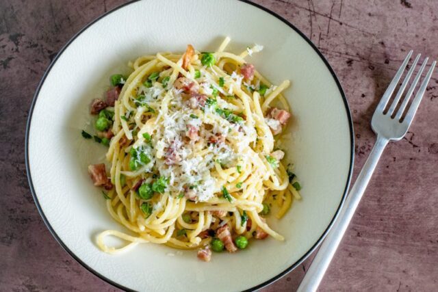 Peas and pancetta make a delicious combination when added to garlicky pasta. A bit of pecorino Romano or Parmesan cheese adds to the amazing flavor in this spaghetti dish!