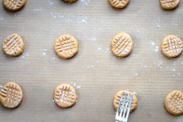 - Dip a fork in flour and press the classic crisscross pattern onto each cookie.