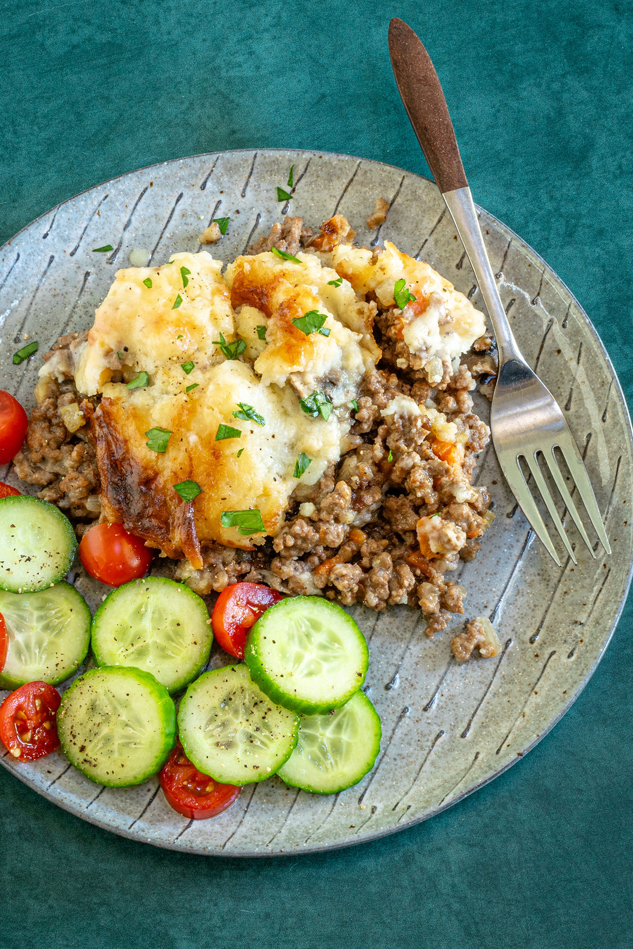 A comforting ground beef casserole topped with cheesy mashed potatoes—easy to make and family approved.