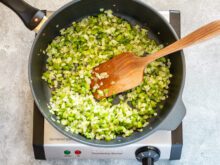 - Cook the Aromatics: Heat the vegetable oil in a large sauté pan or skillet over medium heat. Add the onion and peppers and cook for 4 to 6 minutes or until the onion is translucent. Add the garlic and cook for 1 more minute.