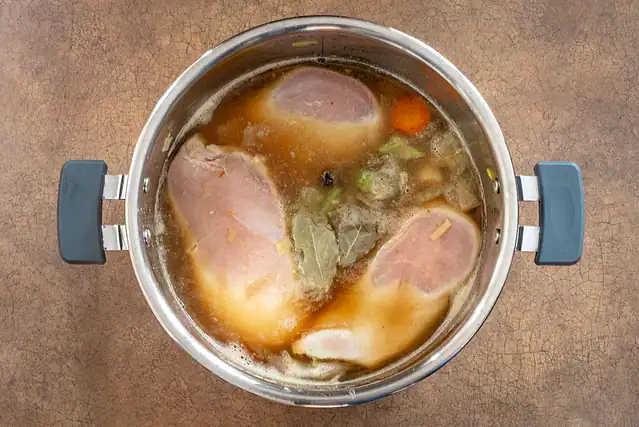 - Add Remaining Ingredients: Add the celery, carrots, prunes, chicken stock, bouillon, and bay leaves to the pot. Stir, scraping the bottom of the pot to loosen any browned bits. Place the chicken breasts in the pot.