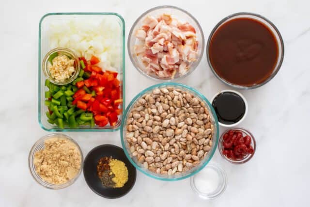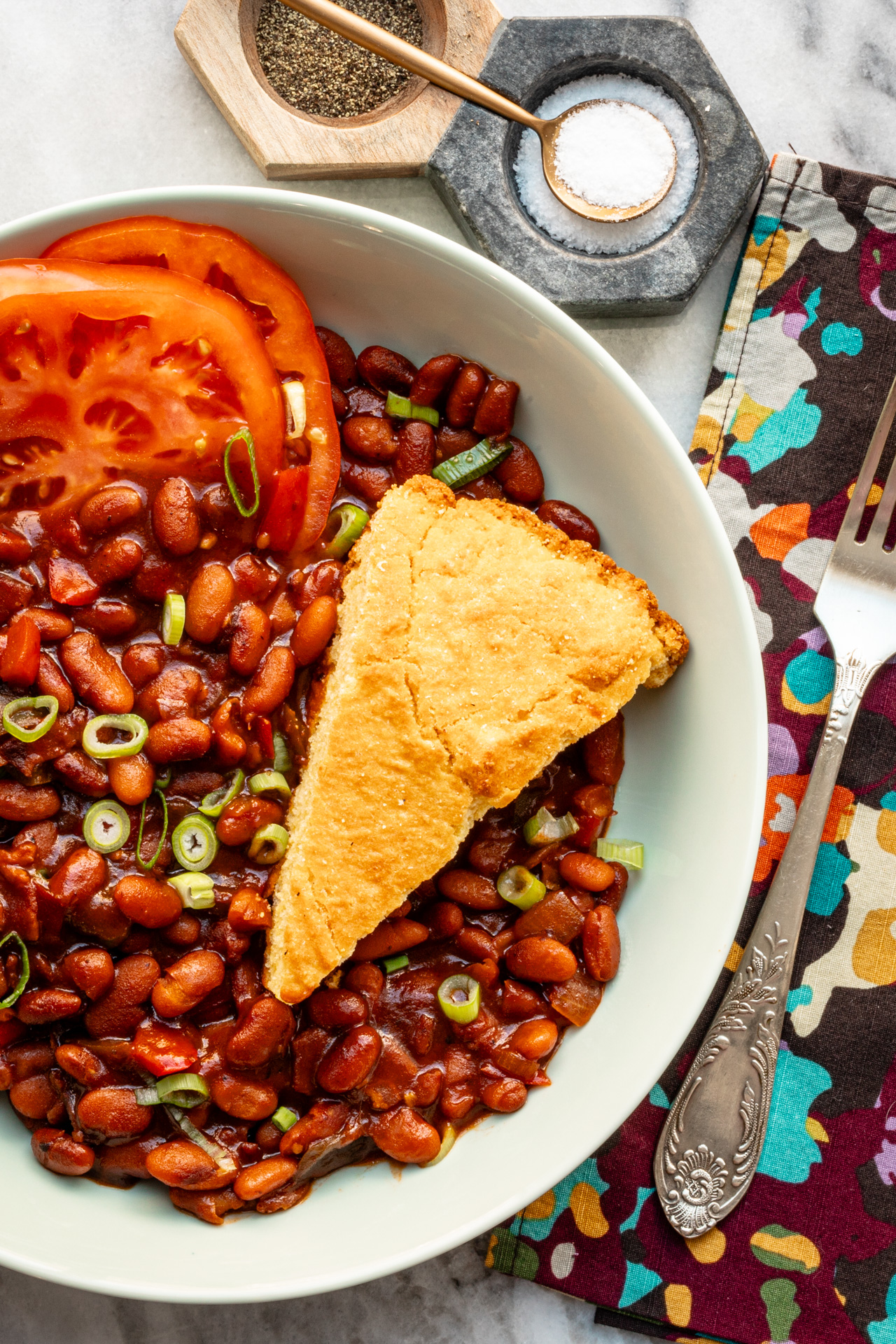 With dried pinto beans, smoky bacon, BBQ sauce, and a touch of molasses, these beans come together in less than 2 hours from start to finish. No soaking is required, and the results are tender, saucy beans with a rich barbecue-style flavor—perfect alongside classic cornbread or biscuits.