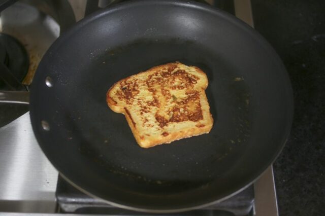 • When the butter is hot, and the foaming subsides, add the bread slices to the skillet.