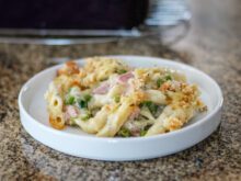 This hearty pasta, ham, and cheese casserole includes penne, ham, peas, and a creamy Fontina cheese sauce. Besides being a complete meal, it’s an excellent way to use leftover baked ham. A buttery breadcrumb topping adds color and crunch to the dish. You can feel free to customize this pasta, ham, and cheese casserole with a different cheese, or replace the peas with another vegetable. Whether for an everyday family meal or potluck dinner, this pasta casserole is sure to please!