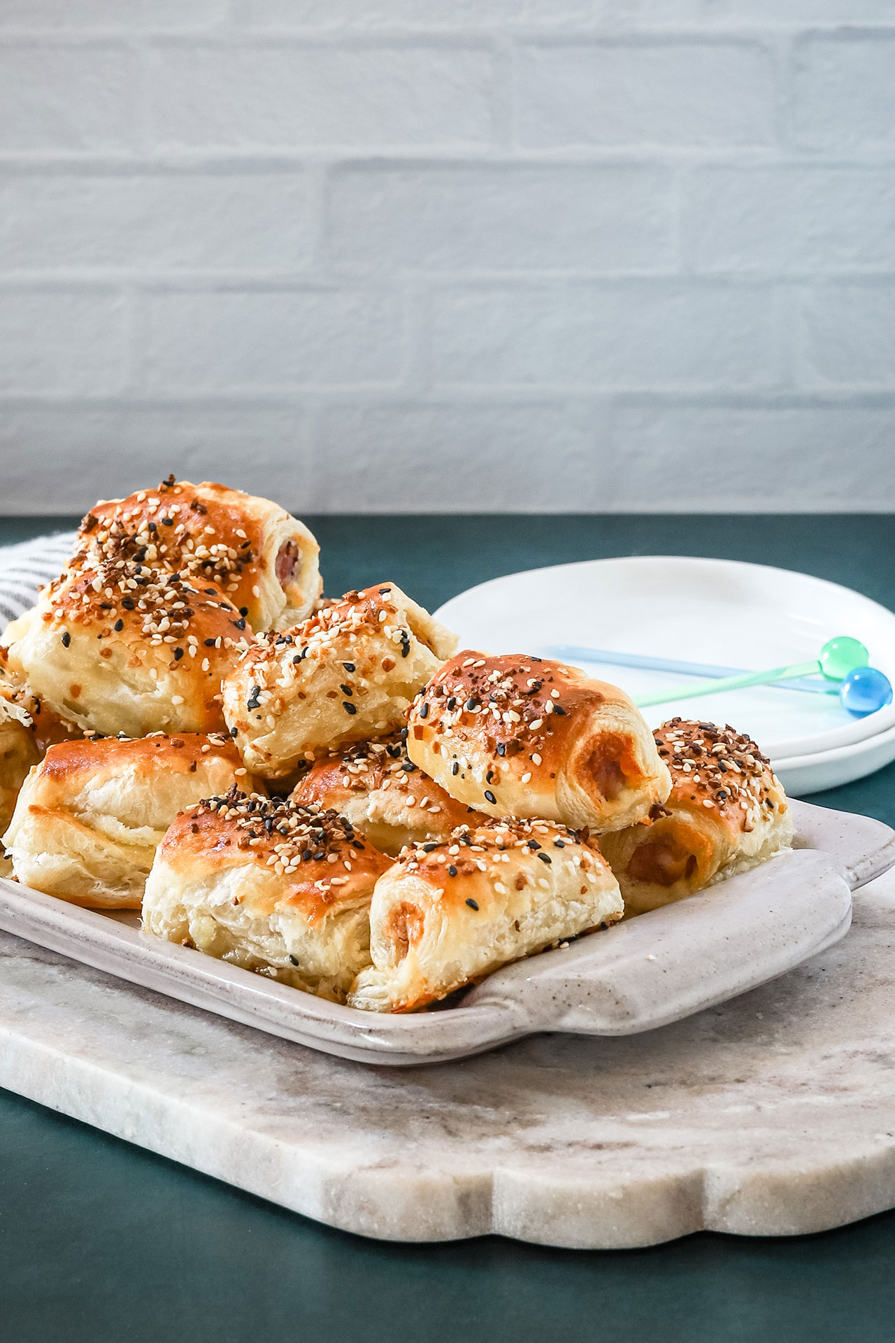 - Arrange the wrapped sausages on a parchment-lined baking sheet, giving space for the pastry to expand. Brush the tops with more egg wash and sprinkle with seasoning.