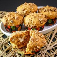 These delicious soft pumpkin muffins are filled with a sweetened cream cheese filling. A streusel topping adds extra flavor and crunch.