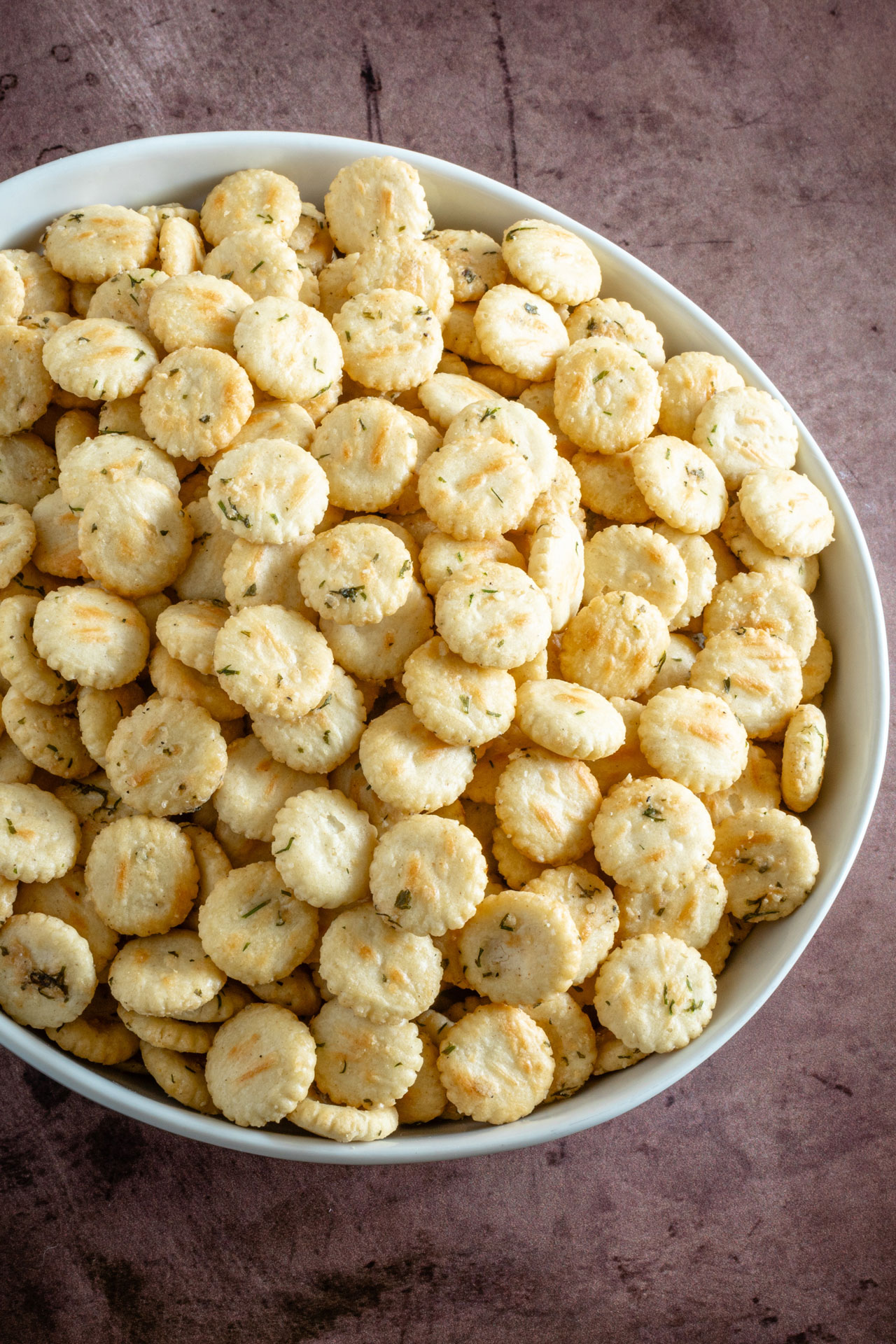 - Add the oyster crackers and toss gently, using a wide bowl so the crackers don’t crush.
