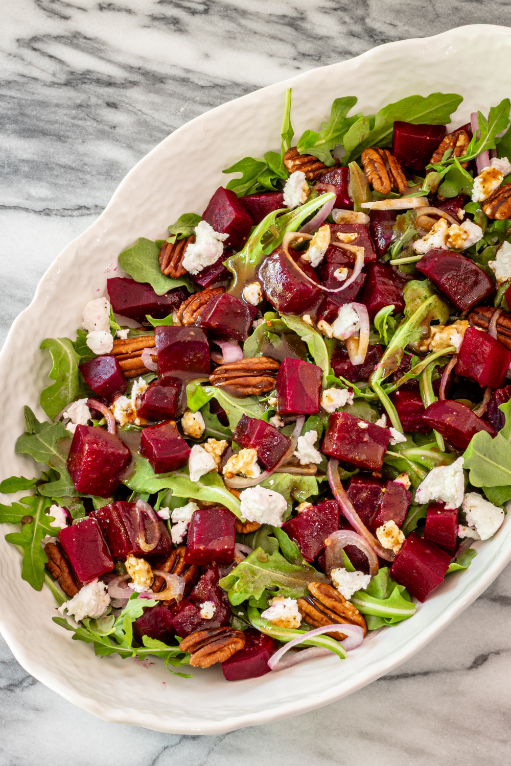 Add a touch of elegance to your table with this roasted beet salad. The combination of balsamic dressing, toasted pecans, and goat cheese is simply divine.