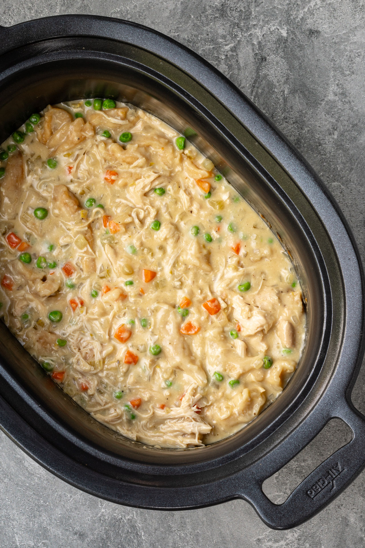 - Peas and carrots – These add color, sweetness, and texture. Thawing them before adding keeps the slow cooker temperature even.