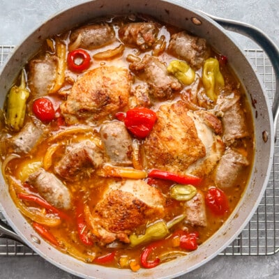 Crispy chicken thighs with sausage, peppers, and a tangy wine-and-pepper brine sauce, oven-baked.