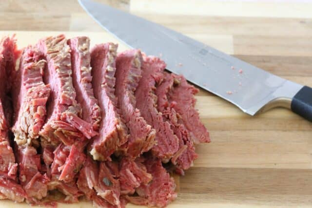 • Remove the corned beef to a cutting board and let it stand for 15 minutes. Slice the meat across the grain and transfer it to a platter.