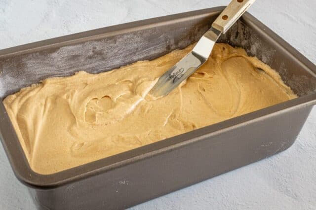 • Turn the batter into the prepared loaf pan and spread evenly.
