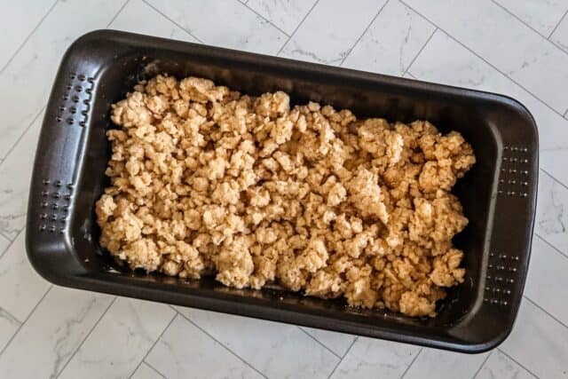 • Put the apples in the prepared loaf pan and top with the crumbs.