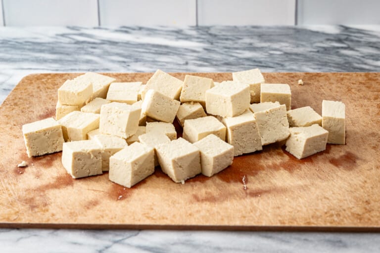 • Prep the tofu. Cut the pressed tofu into 1-inch cubes and place it in a shallow baking dish or container.