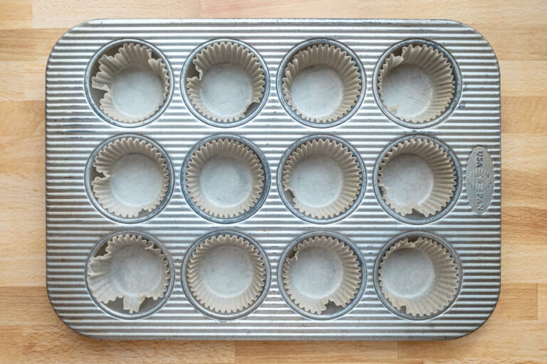 • Prep the pan and oven. Line a 12-cup muffin tin with paper liners and preheat the oven to 375 F.