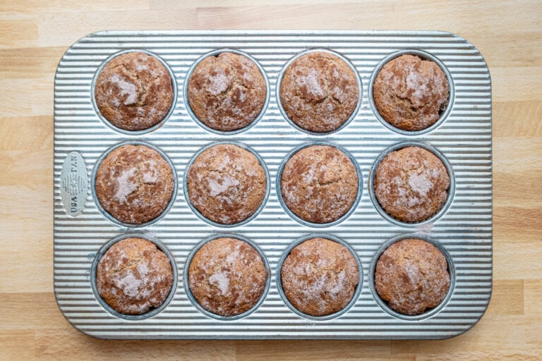 • Bake the muffins. Transfer the pan to the oven and bake the muffins for 17 to 20 minutes or until a toothpick inserted into the center of a muffin comes out clean or with just a few crumbs clinging.